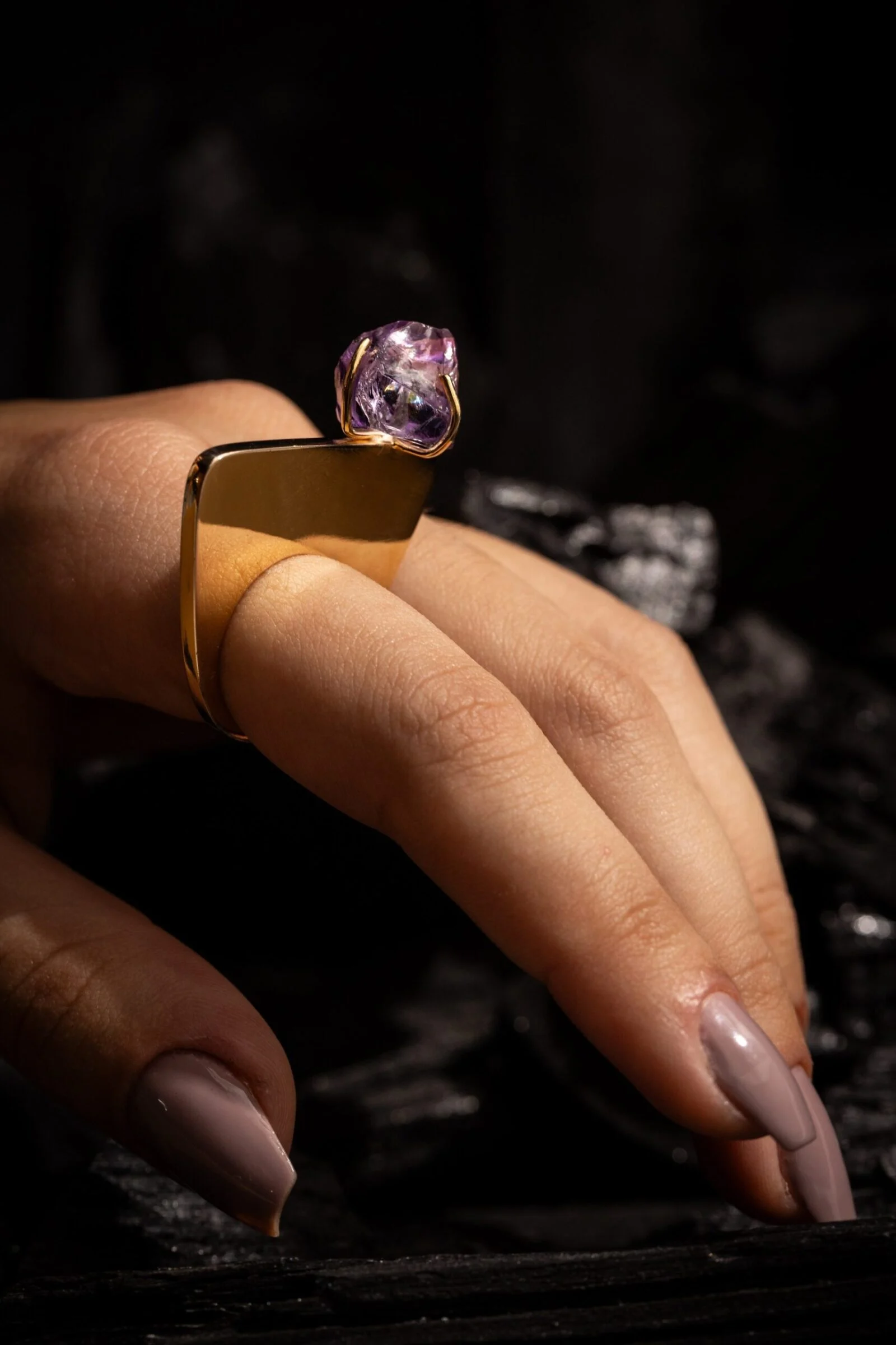 O anel Essência Ametista é feito em prata 950, ametista e banhado a ouro 18 quilates.