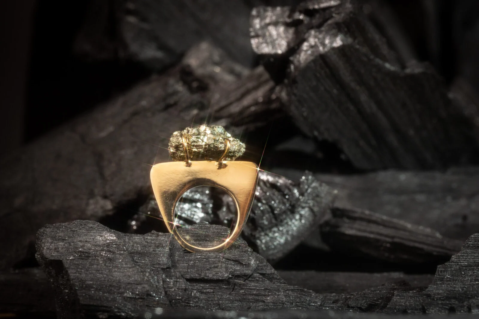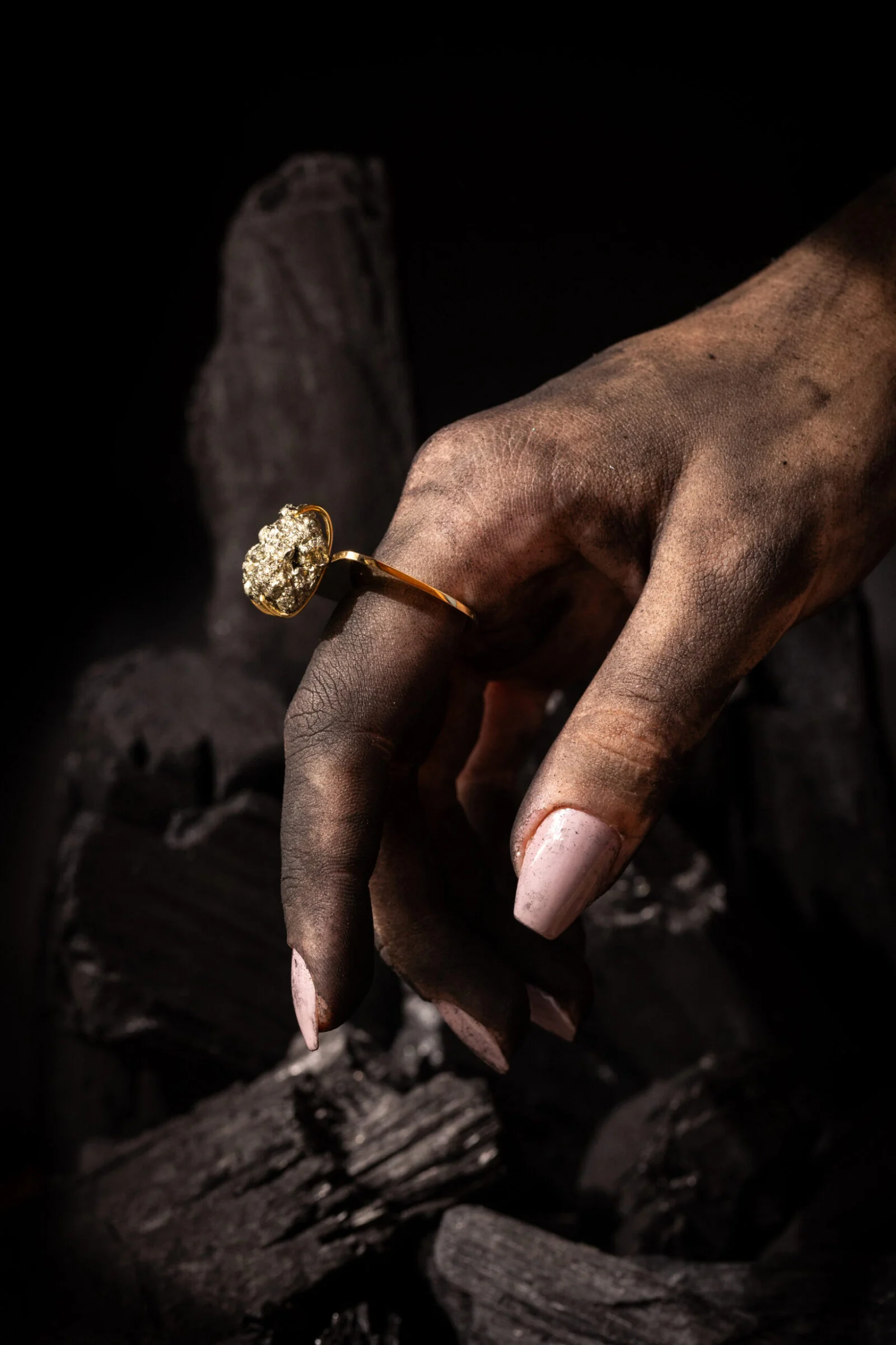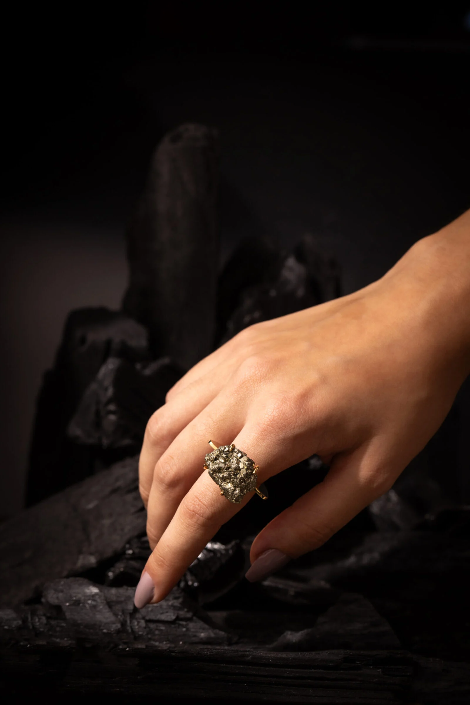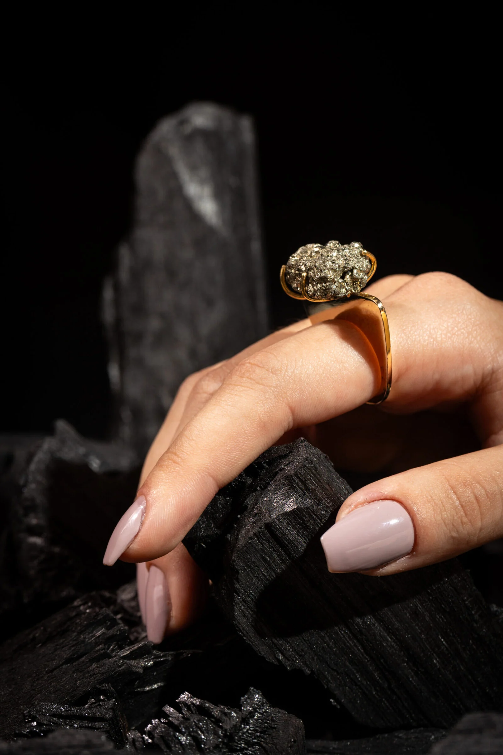 O anel Essência Pirita é feito em prata 950, pirita e banhado a ouro 18 quilates.