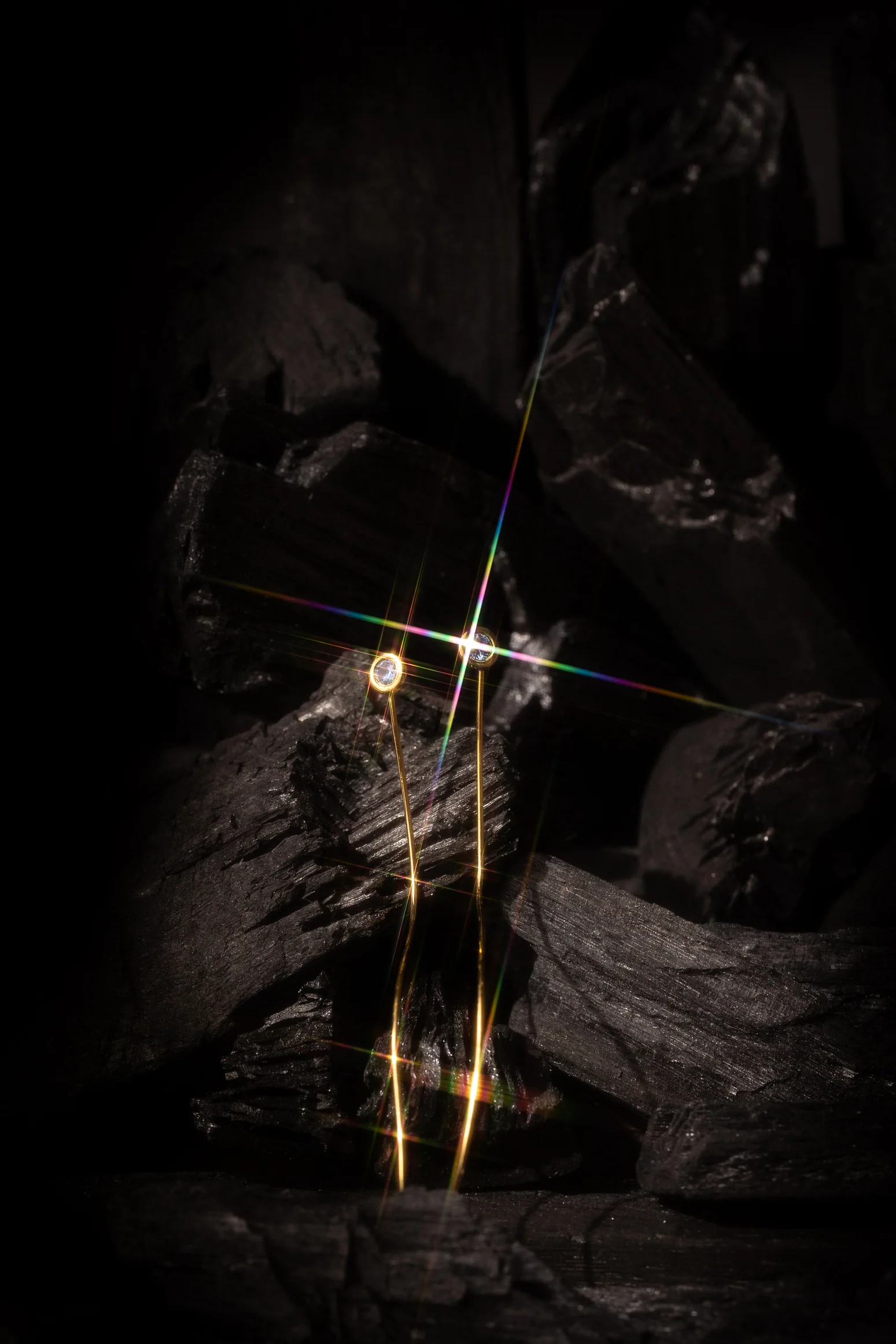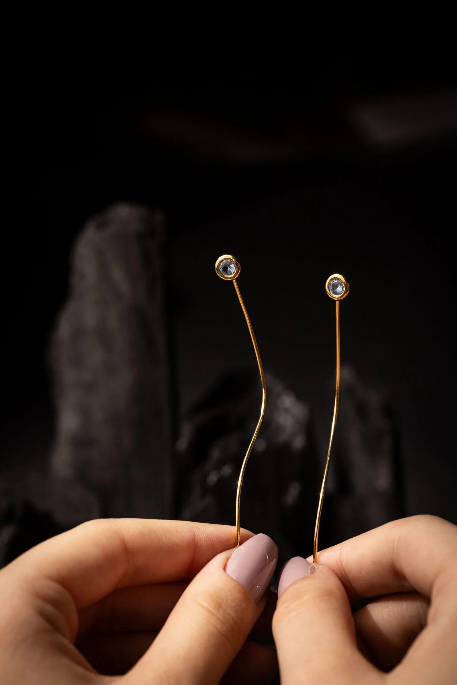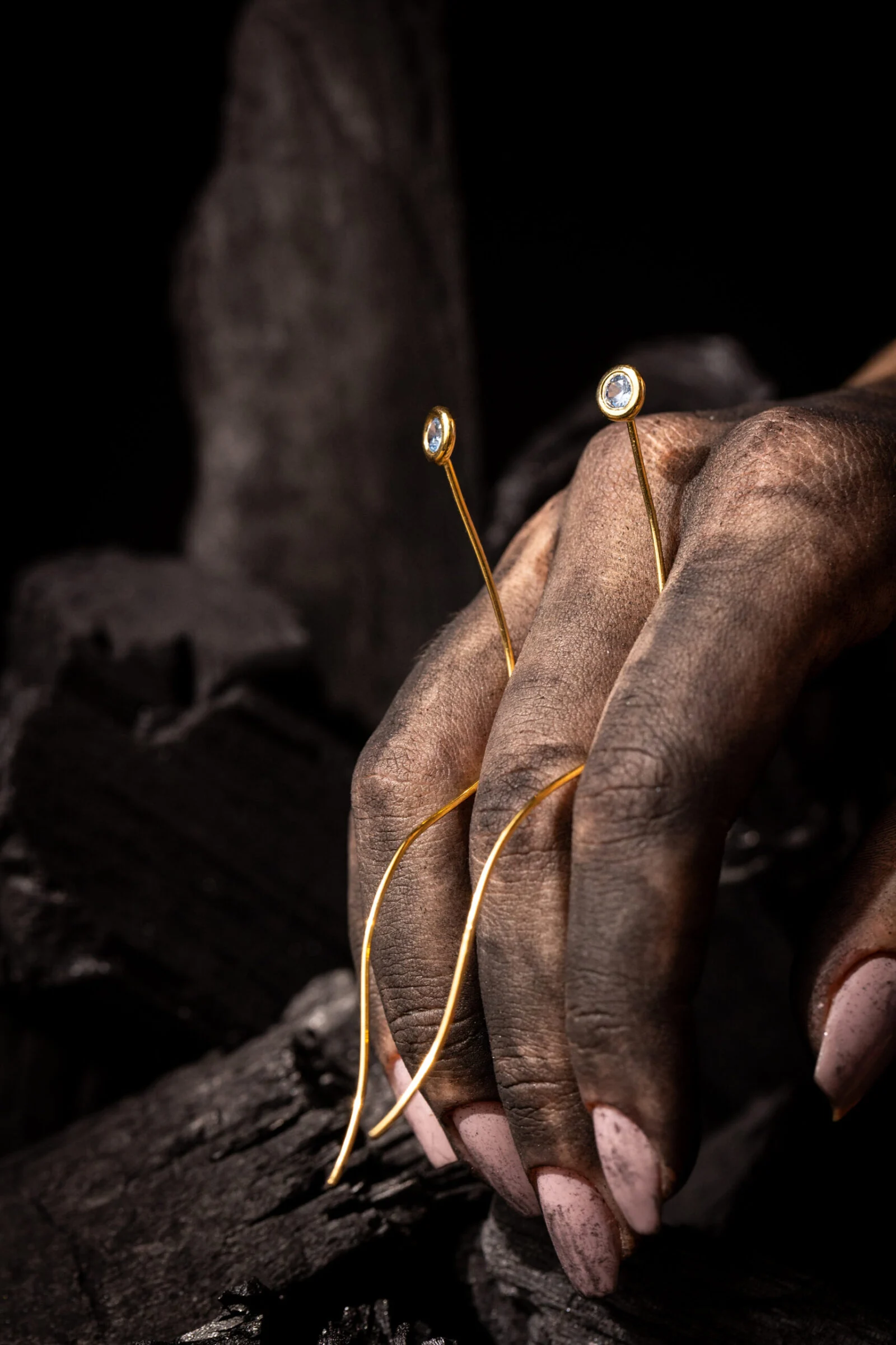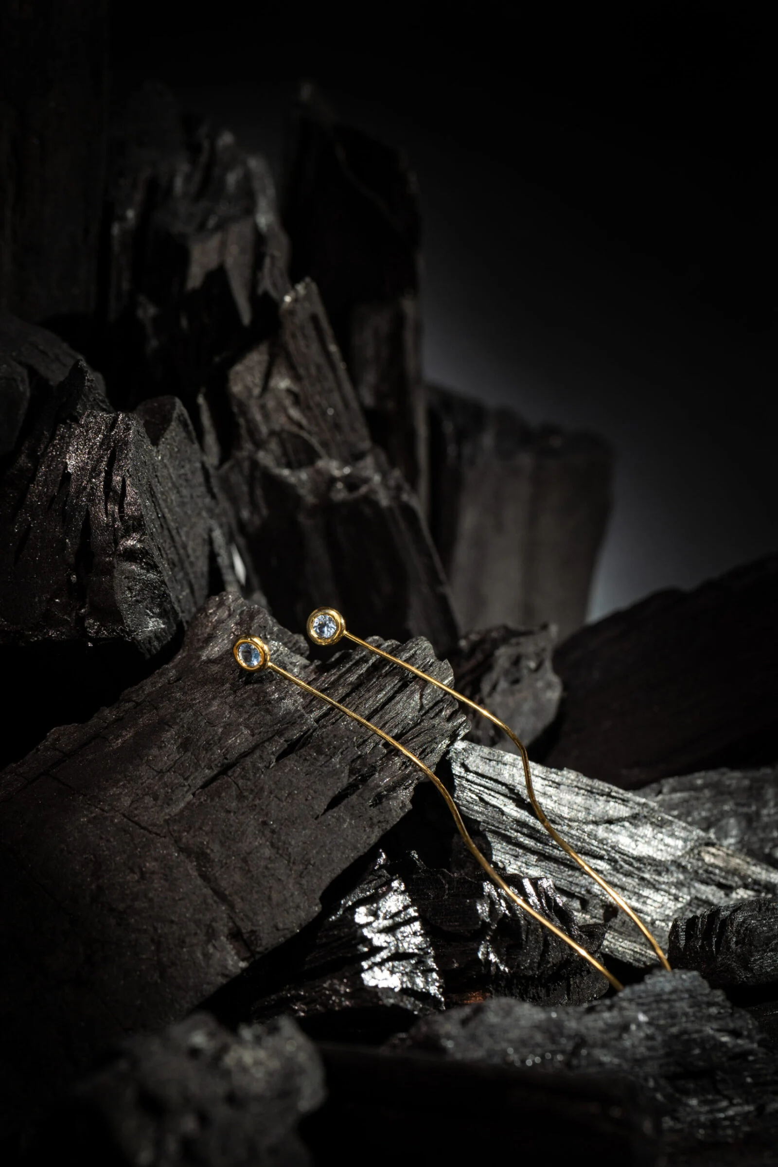 Os brincos Trajetória possuem zirconias redondas, são feitos em prata 950 e banhado a ouro 18 quilates.
